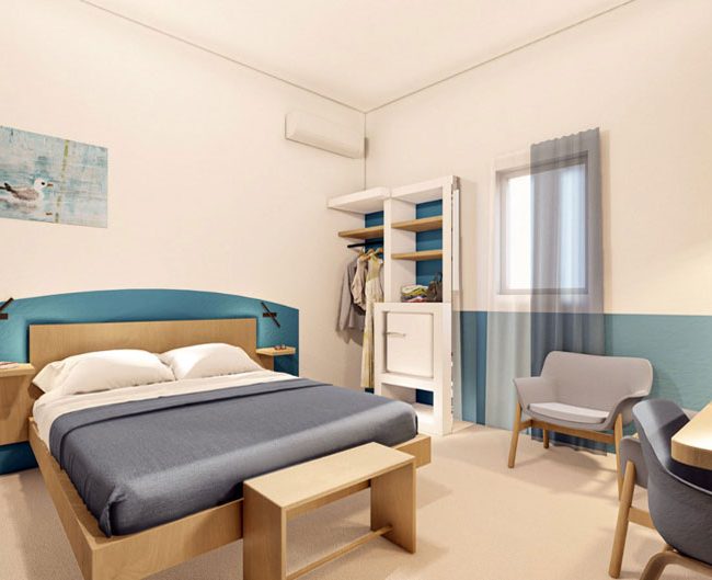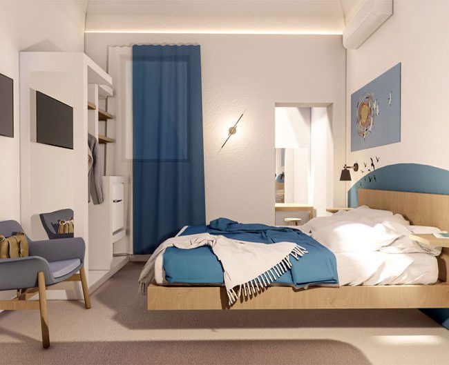 Blu di Levante è una camera in affitto a Favignana con esposizione interna. Con i suoi 30mq, gli spazi sono ottimizzati e il confort è garantito.